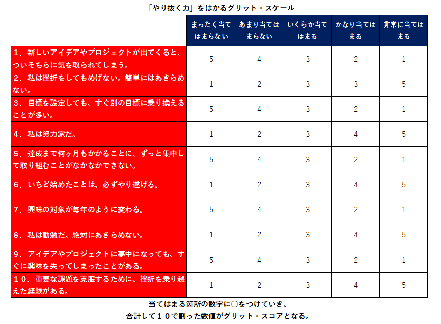 グリット・スケールを使って、自分のグリットレベルを測定してみましょう。